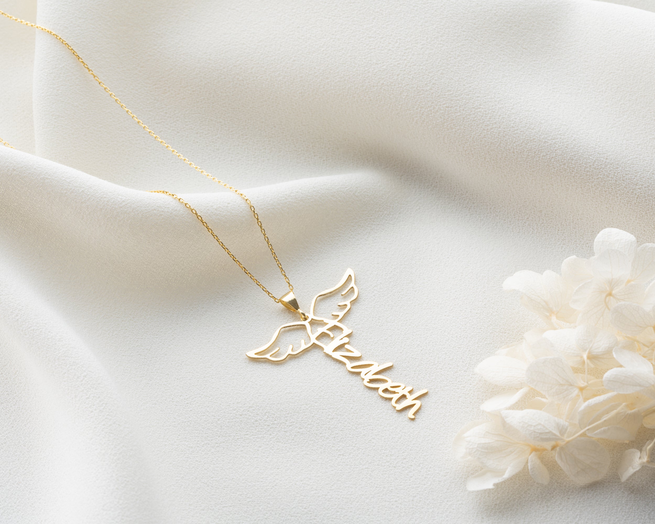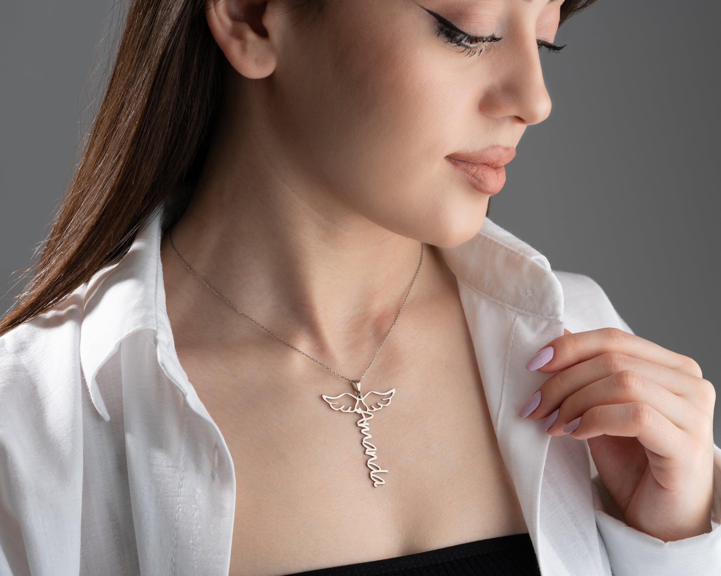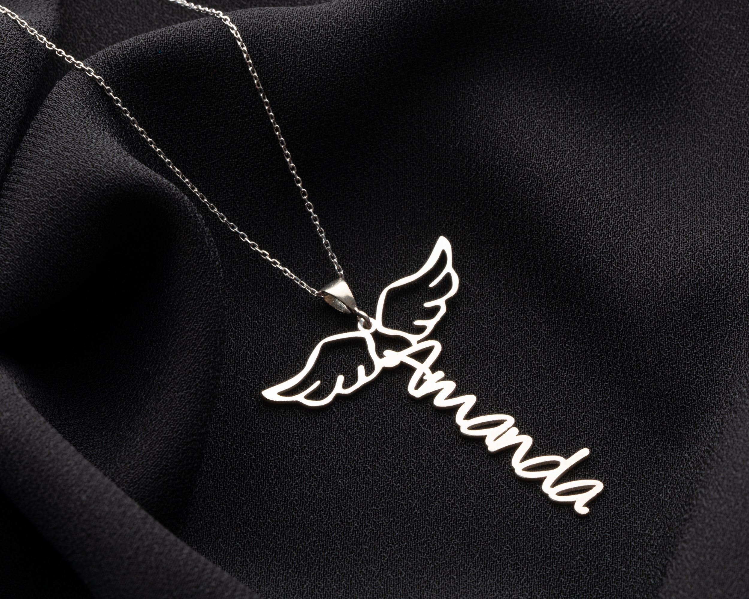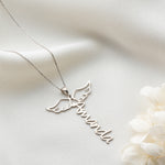 Carry the name of your loved one under the protection of angels. This unique Angel Wing Vertical Name Necklace combines personalization with profound meaning.