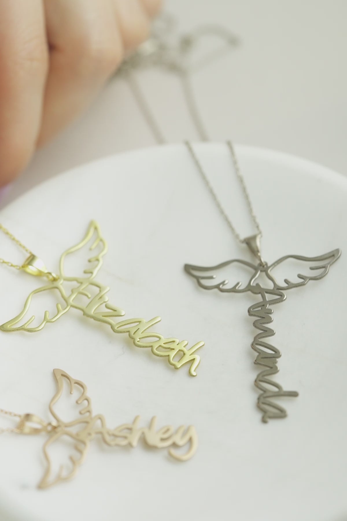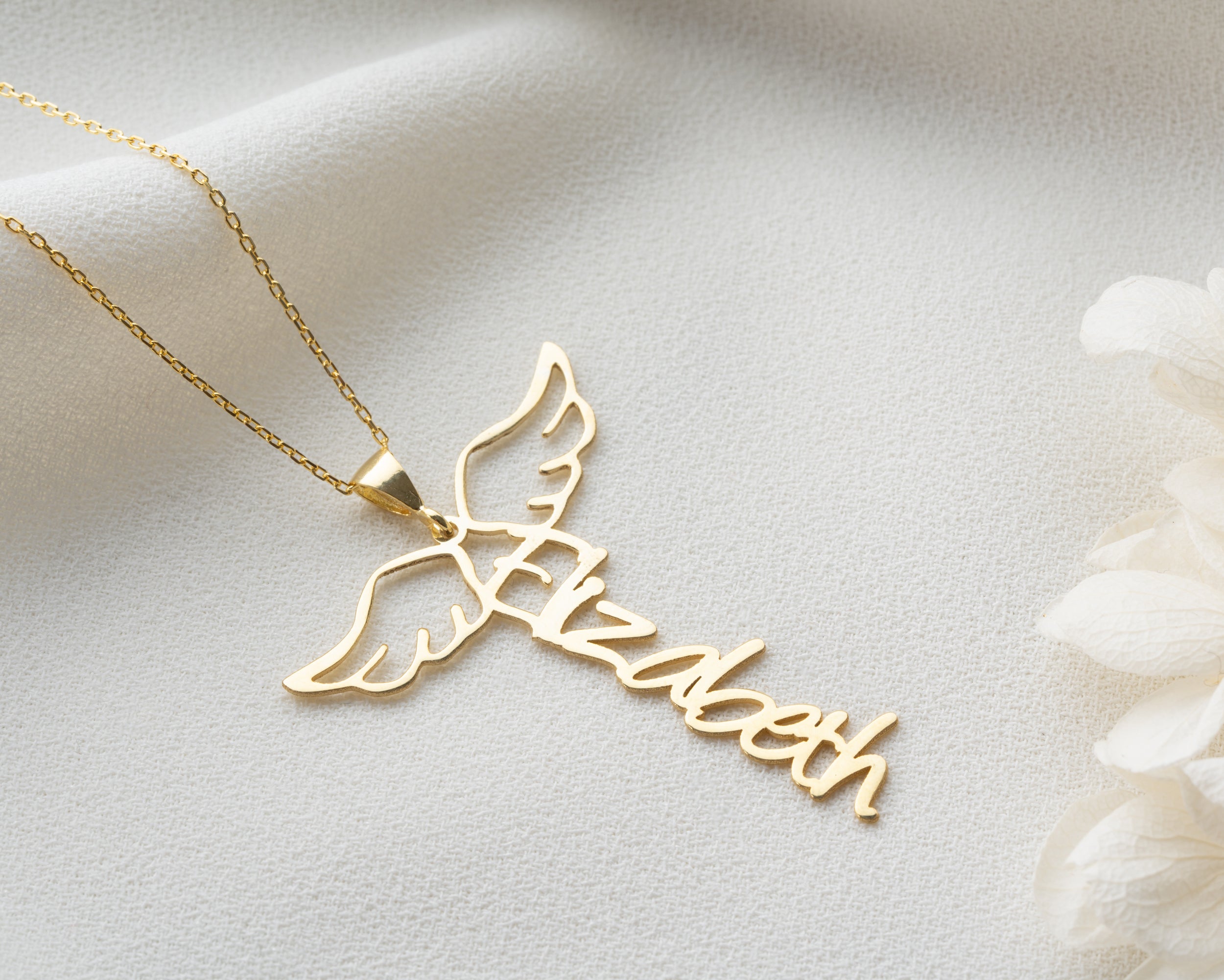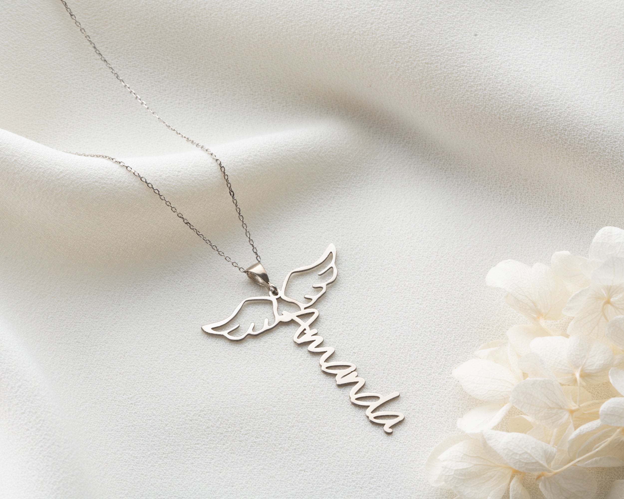 • Protective Meaning: The elegant angel wing charm positioned beside the name surrounds the wearer with energy of guidance and protection. It can symbolize spirituality or the memory of a passed loved one.