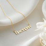 Our Custom Russian Name Necklace is a stunning tribute to the heritage and beauty of the Slavic culture. Featuring the distinct and powerful characters of the Cyrillic alphabet, this personalized nameplate turns your name or a meaningful word into a sophisticated statement piece. It is the perfect blend of ancestral pride and contemporary jewelry design.
