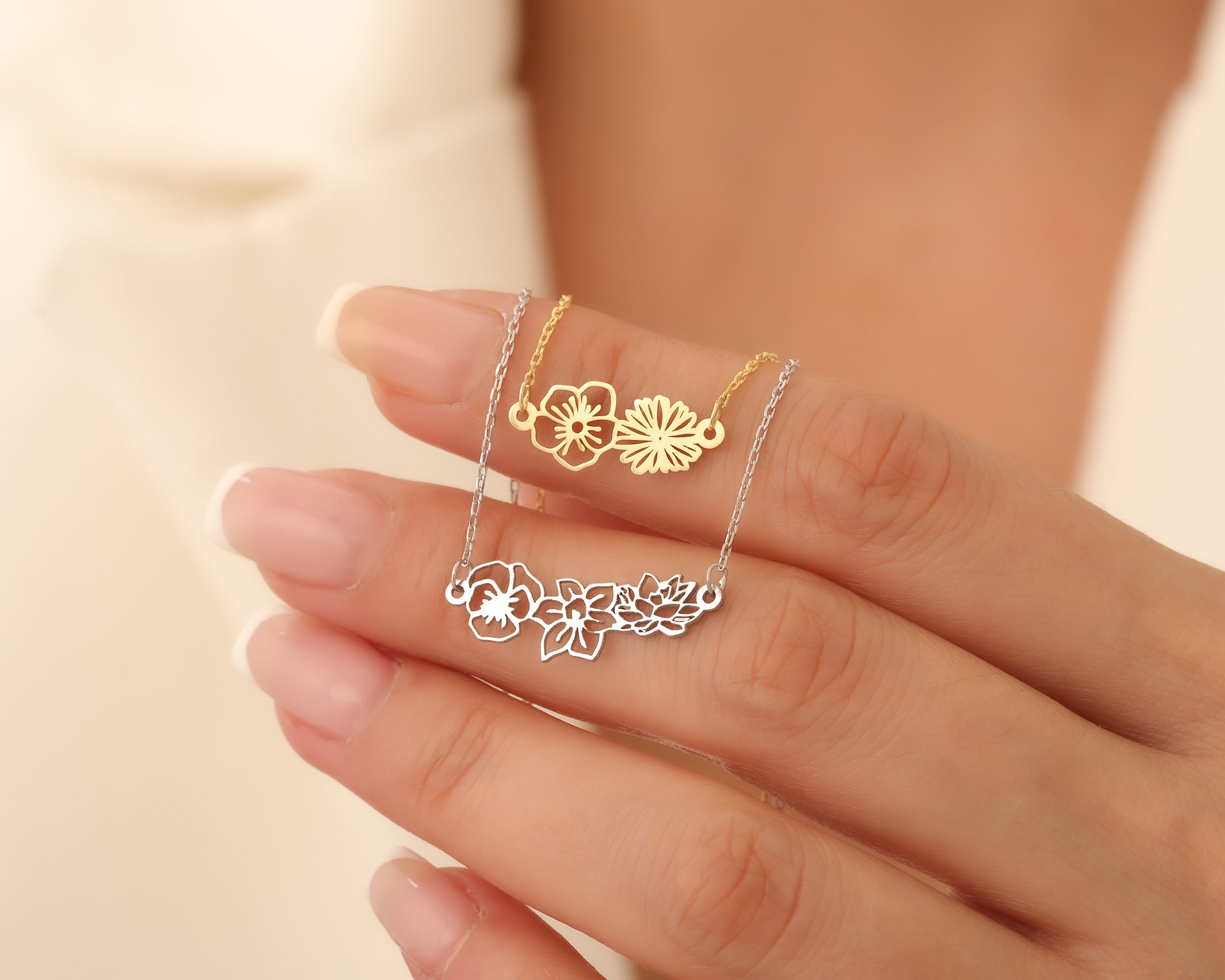 Embrace the beauty of nature with our Dainty Custom Birth Flower Necklace. This minimalist piece is designed for those who appreciate subtle elegance. By combining up to 7 delicate flower charms, you can create a personalized "Family Bouquet" that sits gracefully near your heart, representing your most cherished bonds in a refined way.