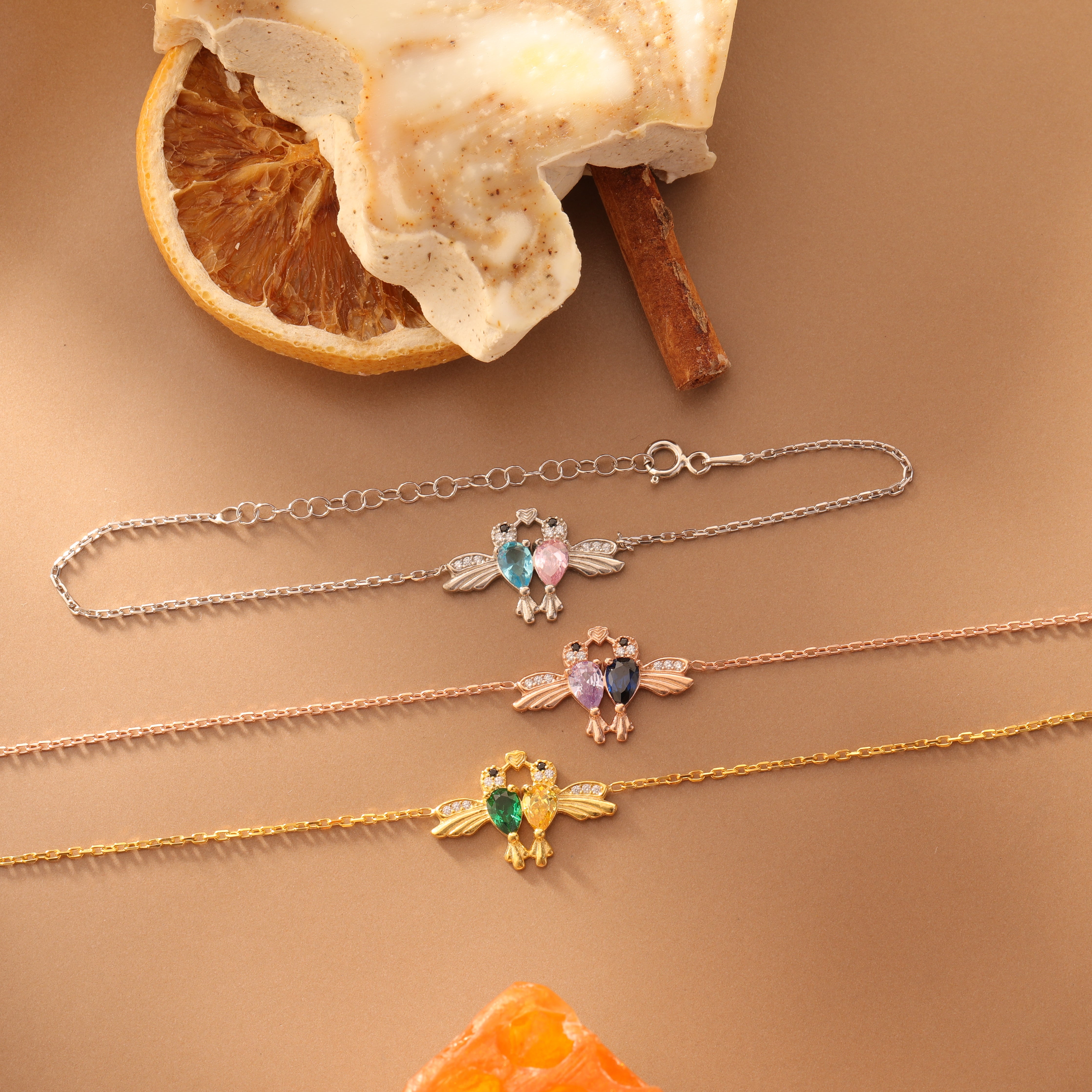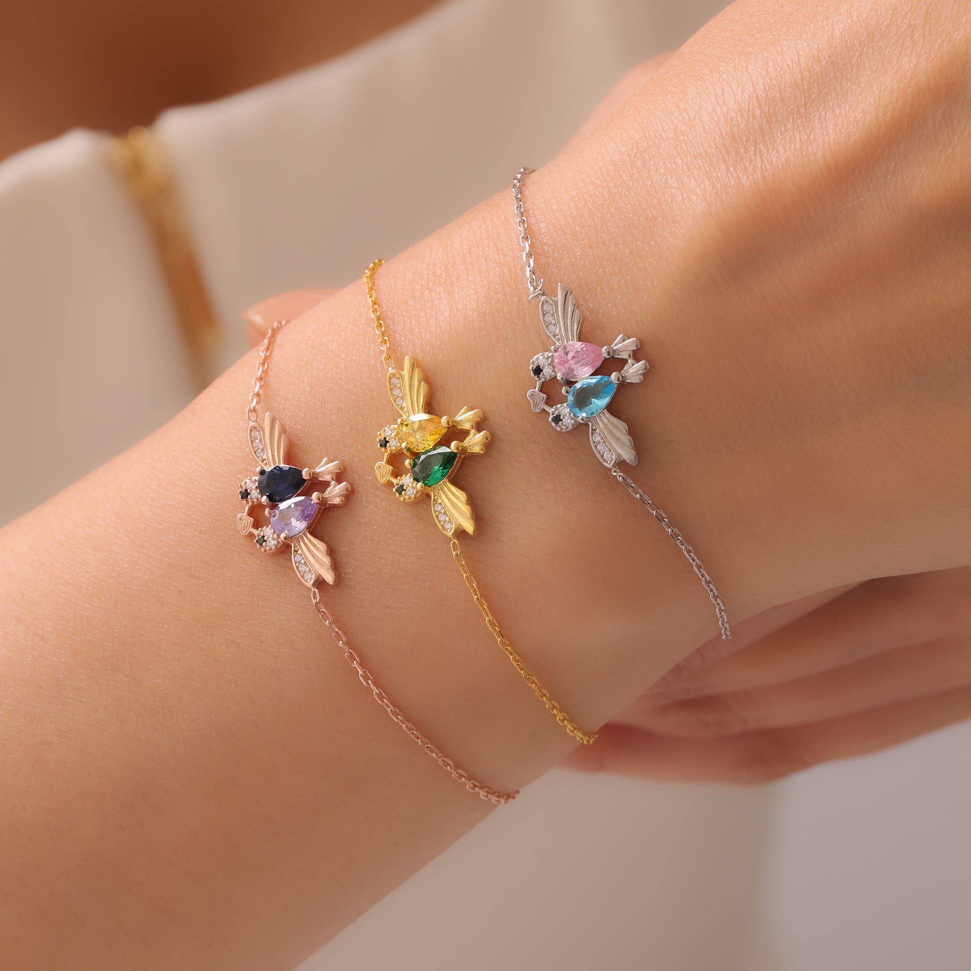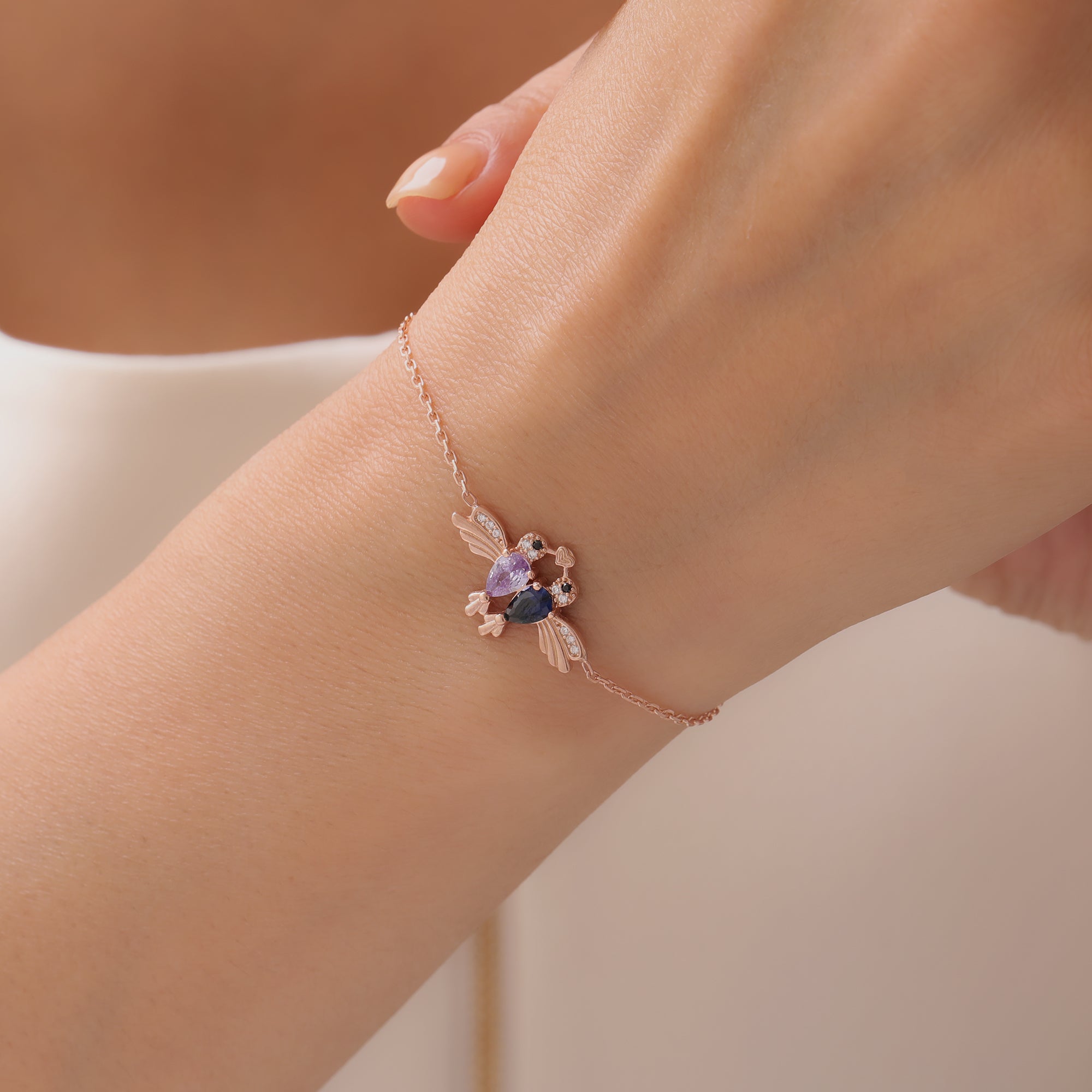 • Personalization Opportunity: The birds' bodies are adorned with two distinct birthstones in contrasting or complementary colors, as seen in the collection. These stones represent the birth months of two special people, turning the bracelet into a unique keepsake.